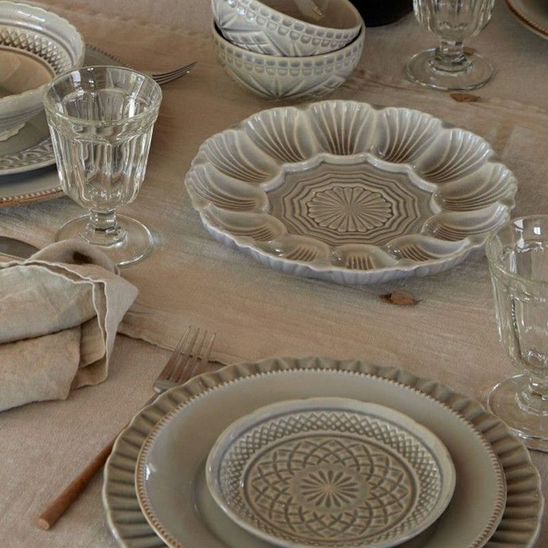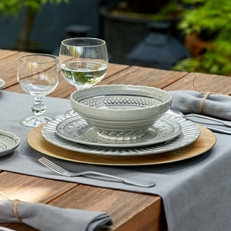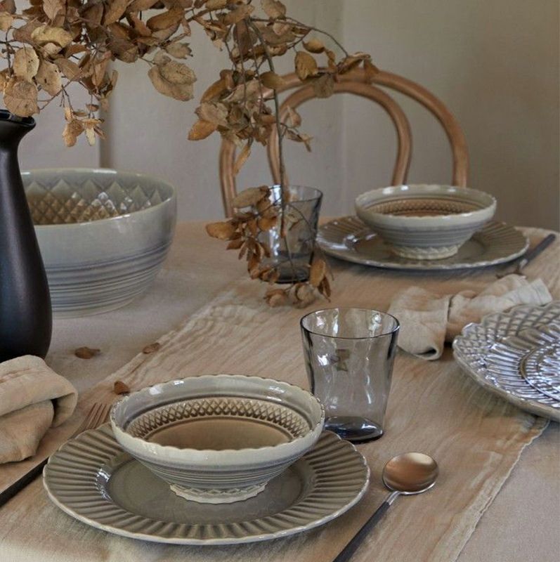 カットグラス、切子ガラスのような個性的なデザインが印象的、釉薬の反応による不思議な色味も魅力的なクリスタルシリーズ。 マザーオブパールをイメージした色味の「ナカル」と、透明感のある「グレー」、やさしい印象の「ホワイト」の3色展開。お皿の種類によって切込み模様の種類が違うのも楽しい、食卓を素敵に彩るシリーズです。