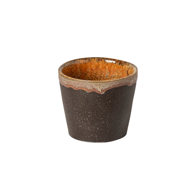 ココアのようなコーヒーのようなマットな色に、キャラメル色の釉薬がかかった、シックな雰囲気のフリーカップ。