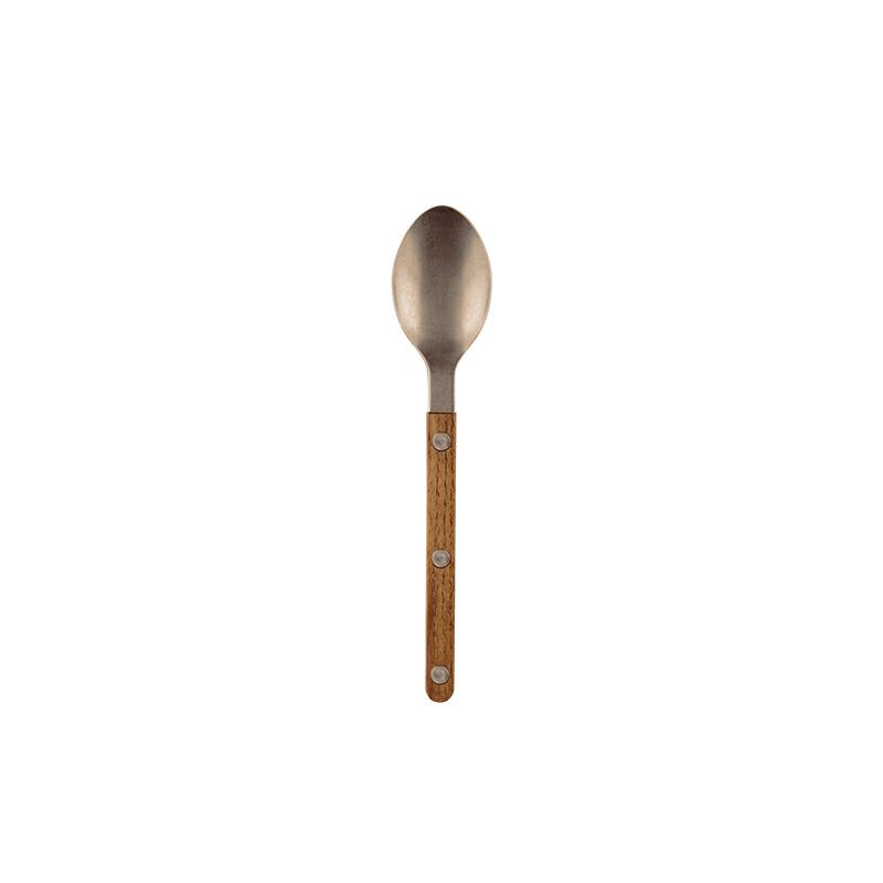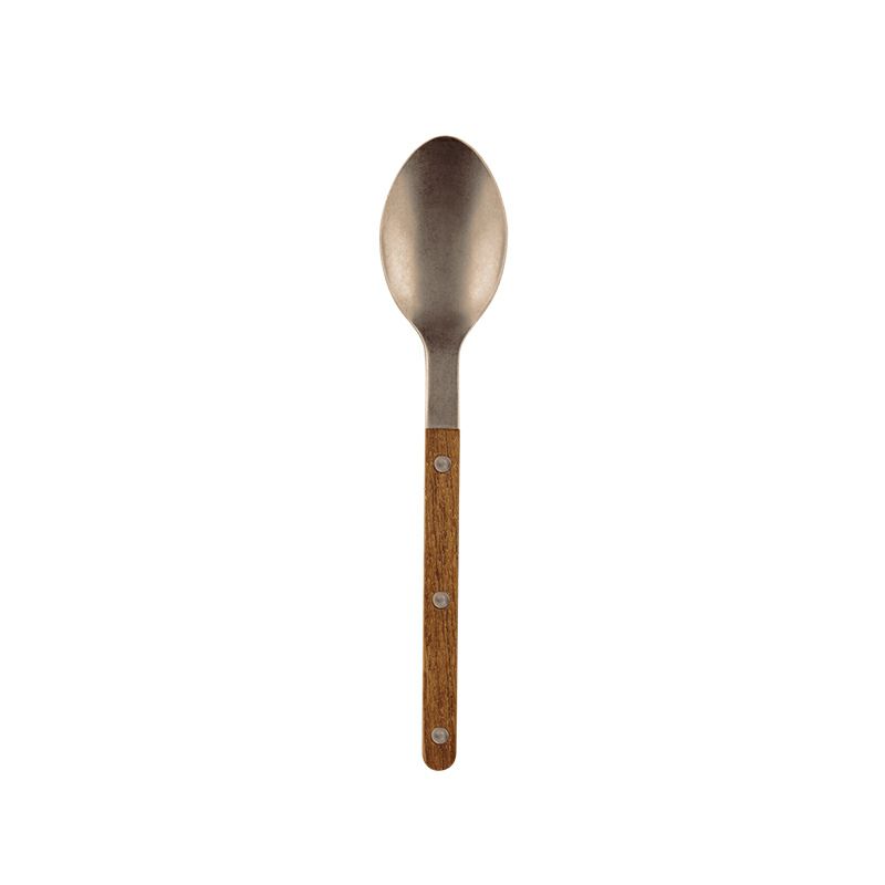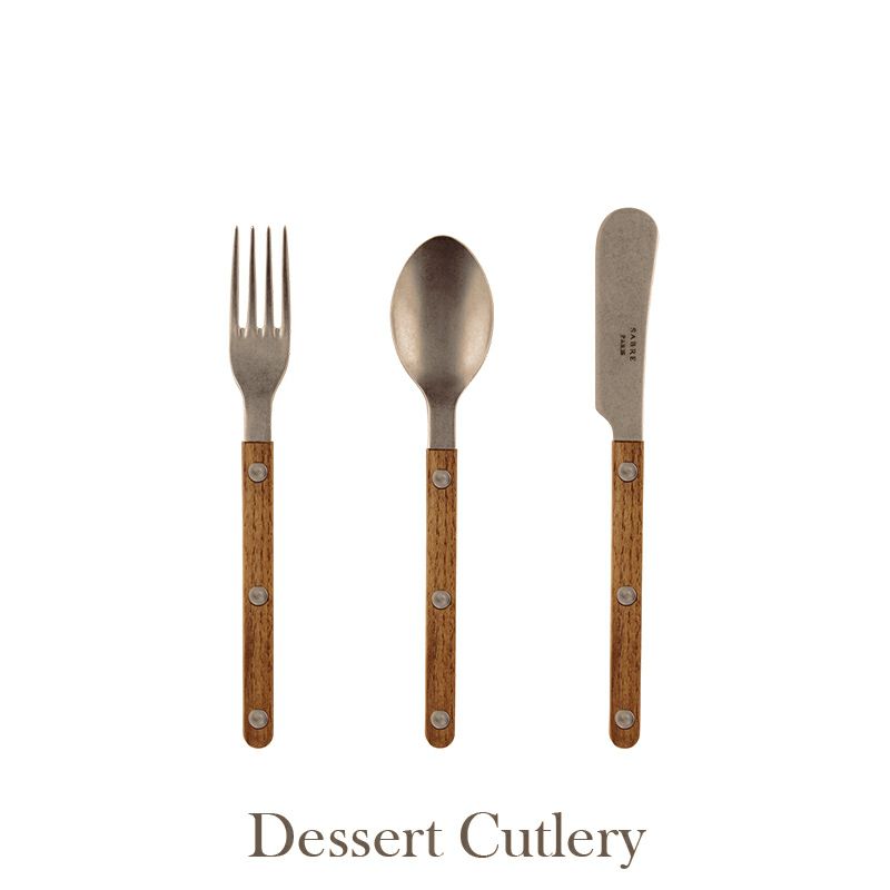 おしゃれな大人のためのカトラリーを発信するフランス・パリのSABRE(サーブル)。チークシリーズは、天然のチーク素材を使って仕上げられています。 すっきりしたシルエットのステンレスのカトラリー本体を、柄の部分は天然木の細身のパネルで上下にサンドイッチ。全体的に細身でスマートな印象です。一つ一つ違うチーク材の木目が感じられる素朴なデザインは、甘くなりすぎないテーブルコーディネートにおすすめです。