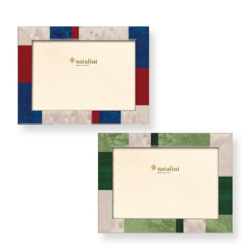 木目を生かして隙間なくパーツをはめ込む伝統的な象嵌(ぞうがん)細工で作られるフォトフレームは、イタリアらしい斬新なデザインと、はっきりとした美しいカラーリングが特徴。