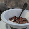 まるで帽子をさかさまにしたようなユニークな形のボウル。かなり深さがり、底がうんとすぼまった形はとてもユニークですが、お料理を自然に引き立ててくれます。