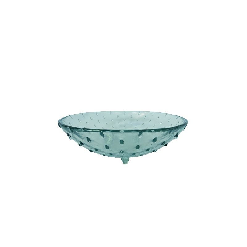 ちょこんとした小さな脚が付いたシルエットと、金平糖のような突起のついたデザインがかわいい、リサイクルガラスの大きいボウルです。