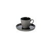 黒っぽいマットな素地と、艶のある真っ黒な釉薬のコントラストが印象的。すっきりとしたシルエットがモダンなティーカップ&ソーサー