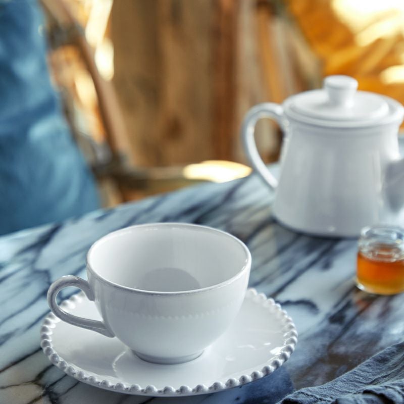 ソーサーのエッジにポコポコとついた丸い飾りが、レースのようでやさしい雰囲気。