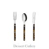 柄の部分はステンレス製のカトラリー本体を、べっ甲柄のアクリル樹脂の板でサンドイッチし、3つのリベットでボタンのように留められています。