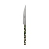柄の部分は、ステンレス製のカトラリーを、カモフラージュ柄のアクリル樹脂の板でサンドイッチし、3つのリベットでボタンのように留められています。