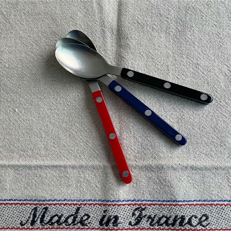 マットでカラフルな色の板で、ステンレス製のカトラリーの柄の部分をサンドイッチし、 3つの丸い金属のリベットでボタンのように留められています。