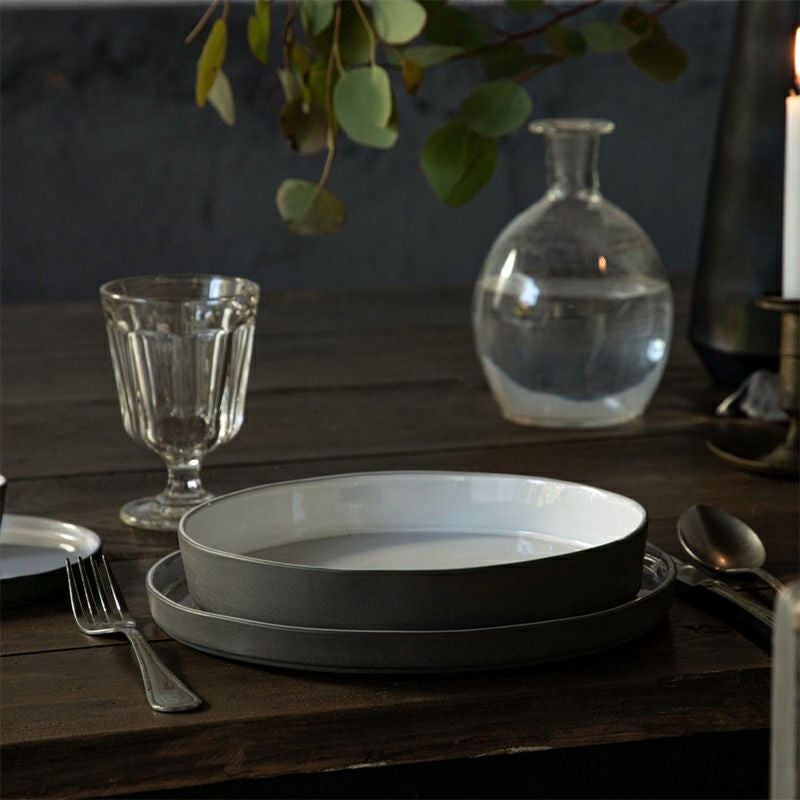 黒っぽい素地と白い釉薬のコントラスト、すっきりとしたシルエットがモダンなスープ&パスタプレート