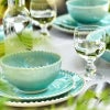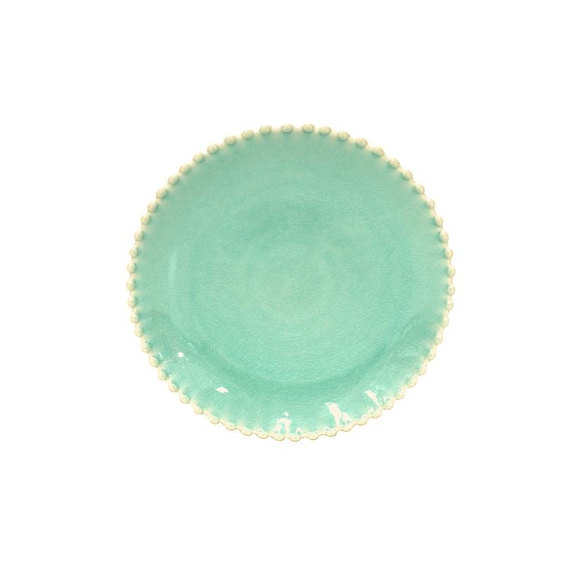 パールをあしらったようなロマンチックでデコラティブなデザインと、 アクアという名前の通り、澄んだ水を思わせる透明感のある色が魅力。 透明感のある釉薬に入った細かい貫入に光が入り、なんともいえない奥行きのあるやわらかい印象を生み出しています。