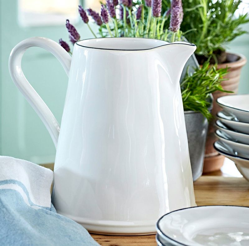 白と青のシンプルで温かみのある色味、すっきりしたシルエットのピッチャー