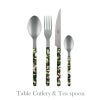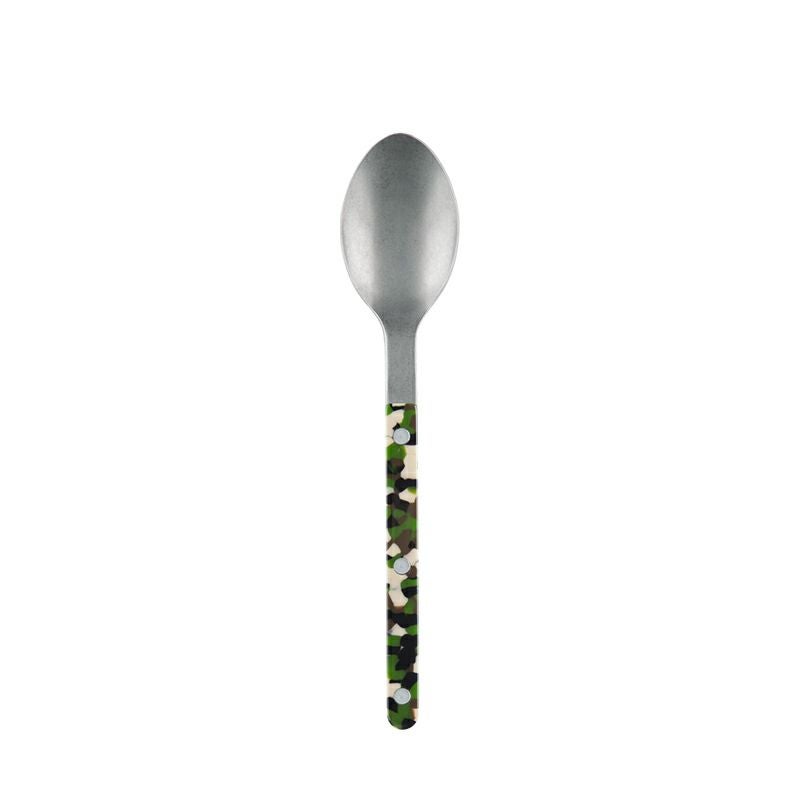 柄の部分は、ステンレス製のカトラリーを、カモフラージュ柄のアクリル樹脂の板でサンドイッチし、3つのリベットでボタンのように留められています。
